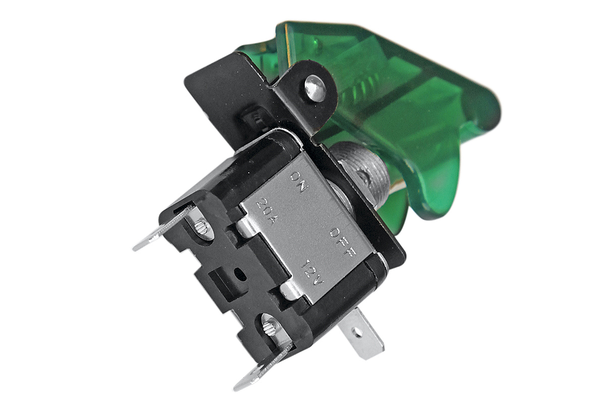 Тумблер имеет функцию подсветки. Для предотвращения произвольного переключения тумблера применяются защитные крышки, которые изготавливаются в различной цветовой гамме. Цвета крышки – зеленый.