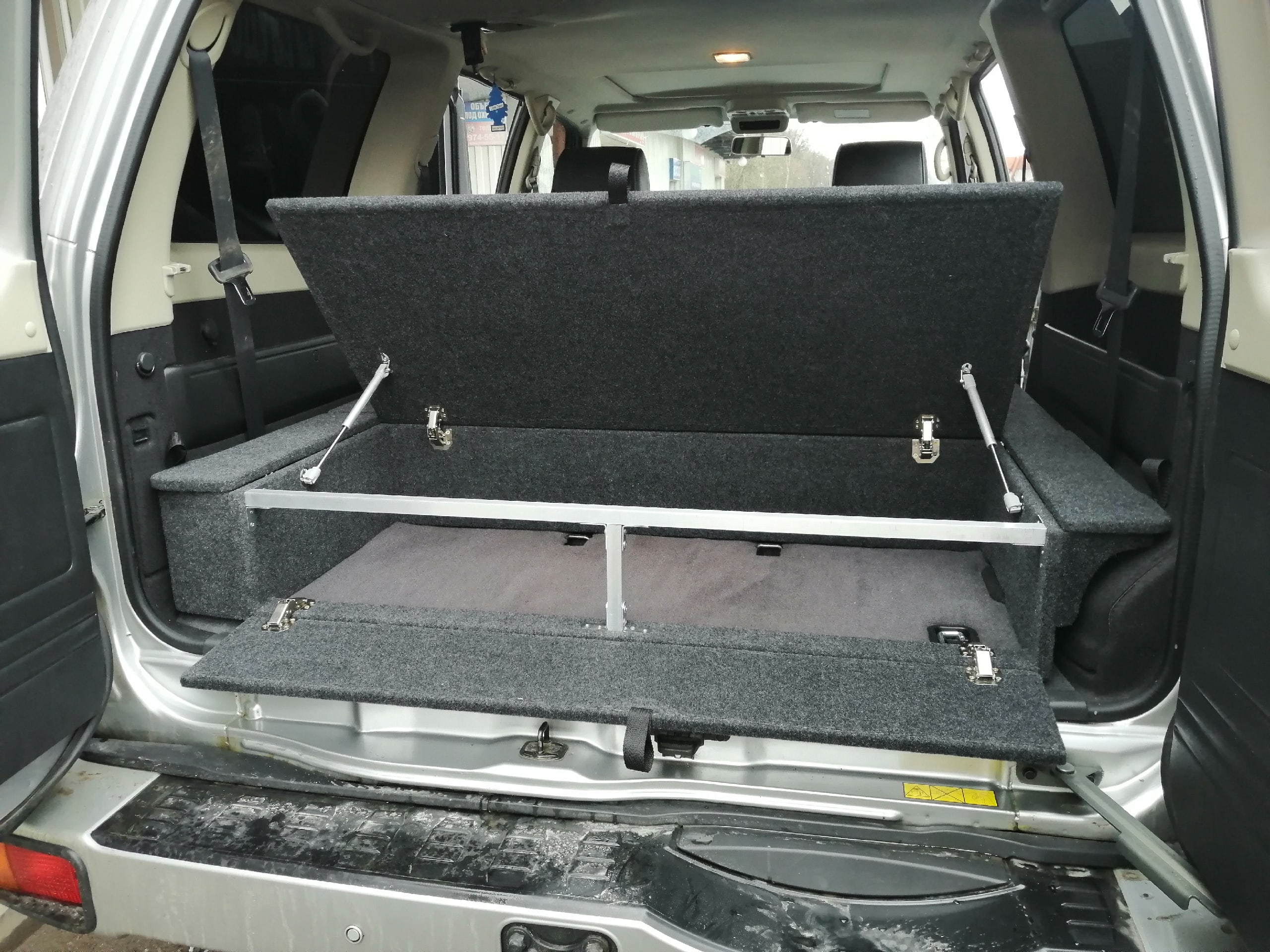 Органайзер-спальник позволяет убрать стропы, огнетушитель, аптечку, компрессор и т.д. в свои просторные ящики. При сложенных спинках задних сидений образует ровный пол, можно обустроить спальное место.