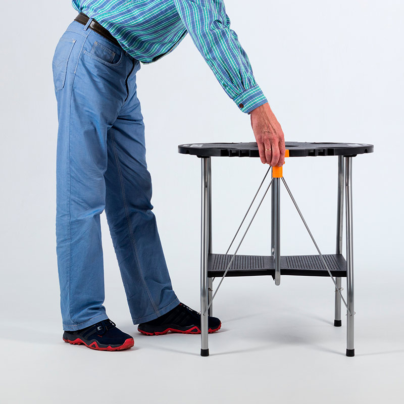 Имеет удобный механизм складывания: одно нажатие на стопорные кнопки по бокам столешницы и стол мгновенно складывается в плоский формат размером всего 65х90х8 см с удобной встроенной ручкой для переноски (см. инструкцию «сложить-разложить»).